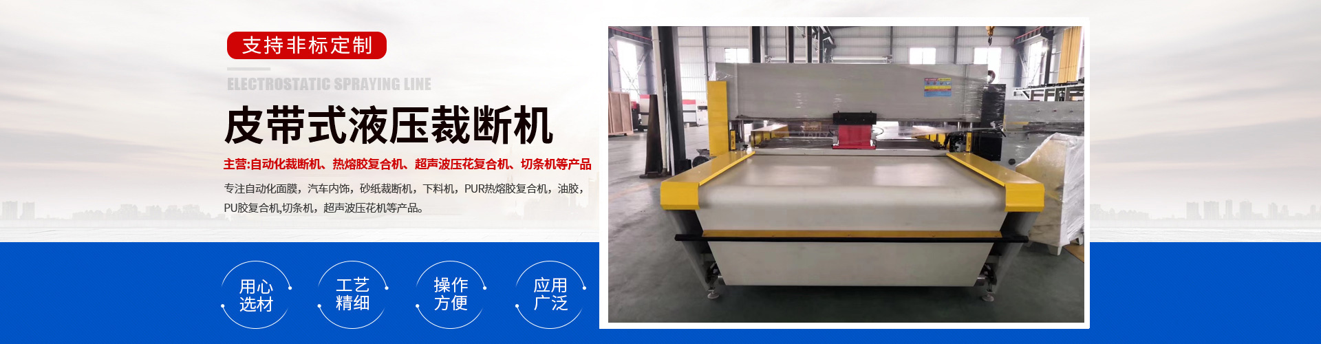 主營產品有砂紙裁斷機、下料機、PUR熱熔膠復合機、油膠PU膠復合機、切條機、超聲波壓花機鑫利來·四大理由